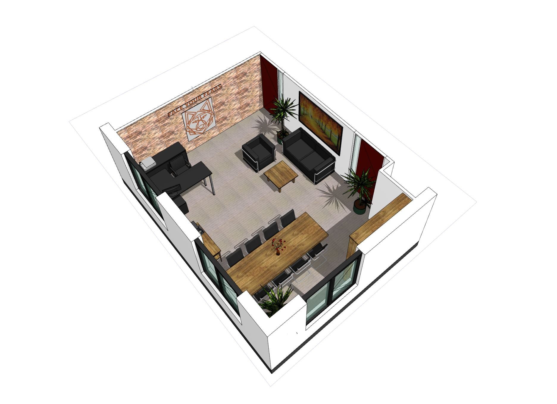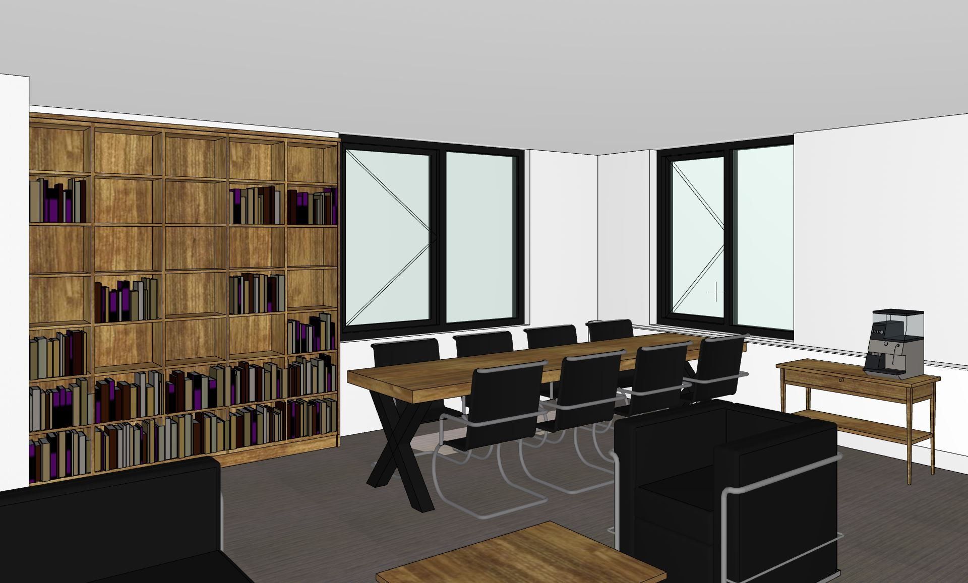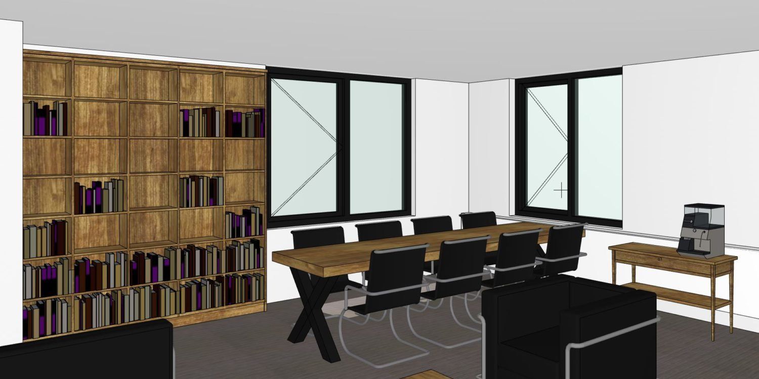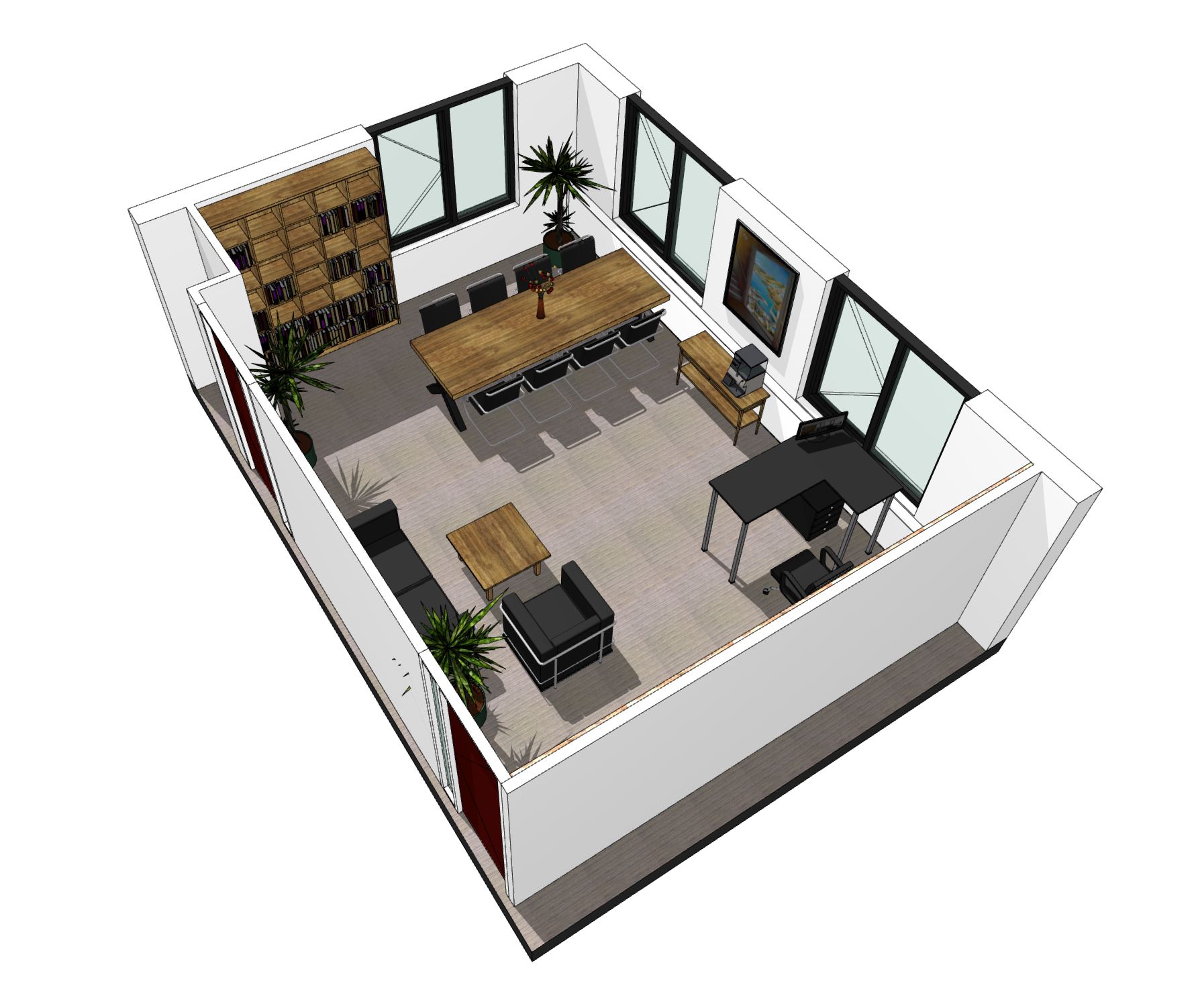 Hierbij was de vraag hoe de opstelling van een zitje, een kast, een grote lees/vergadertafel en een bureau en dergelijke het best ingepast kon worden in een kantoor.