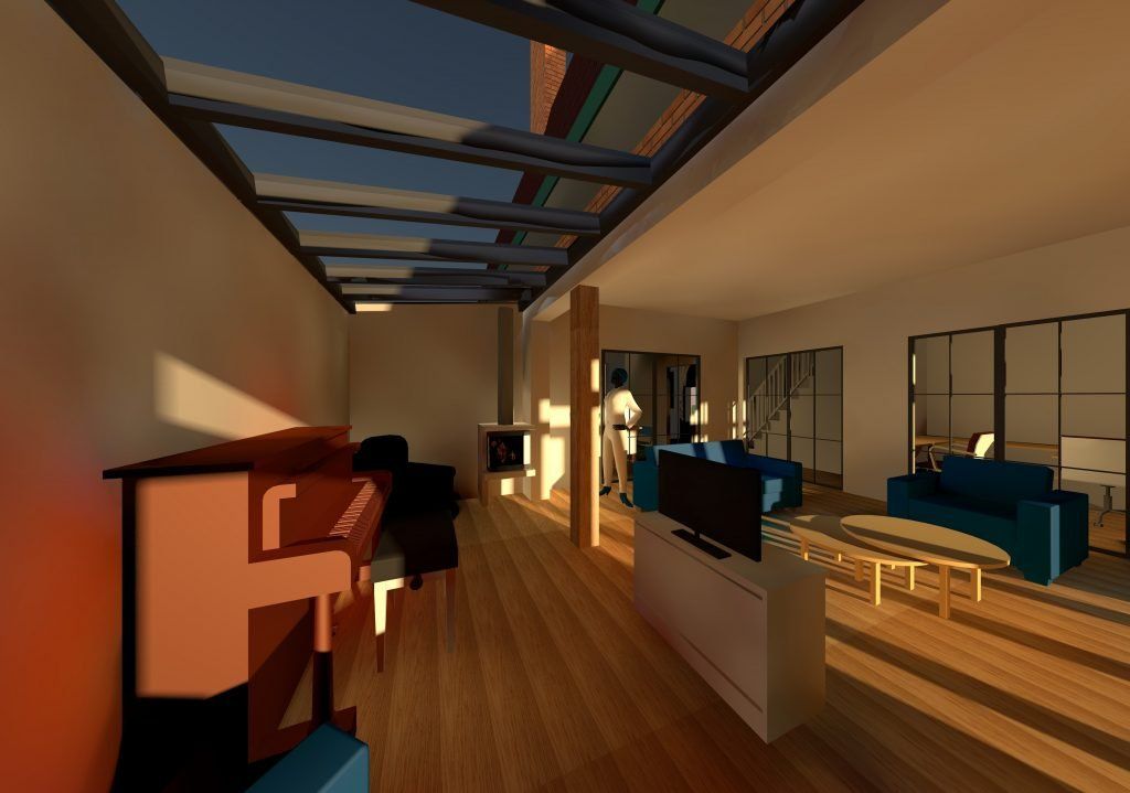 De grote glazen puien van de ene ruimte naar de andere zorgen voor contact met elkaar, licht maar ook een eigen afsluitbare plek. Het licht van boven door het grote dakraam stroomt het hele huis binnen.