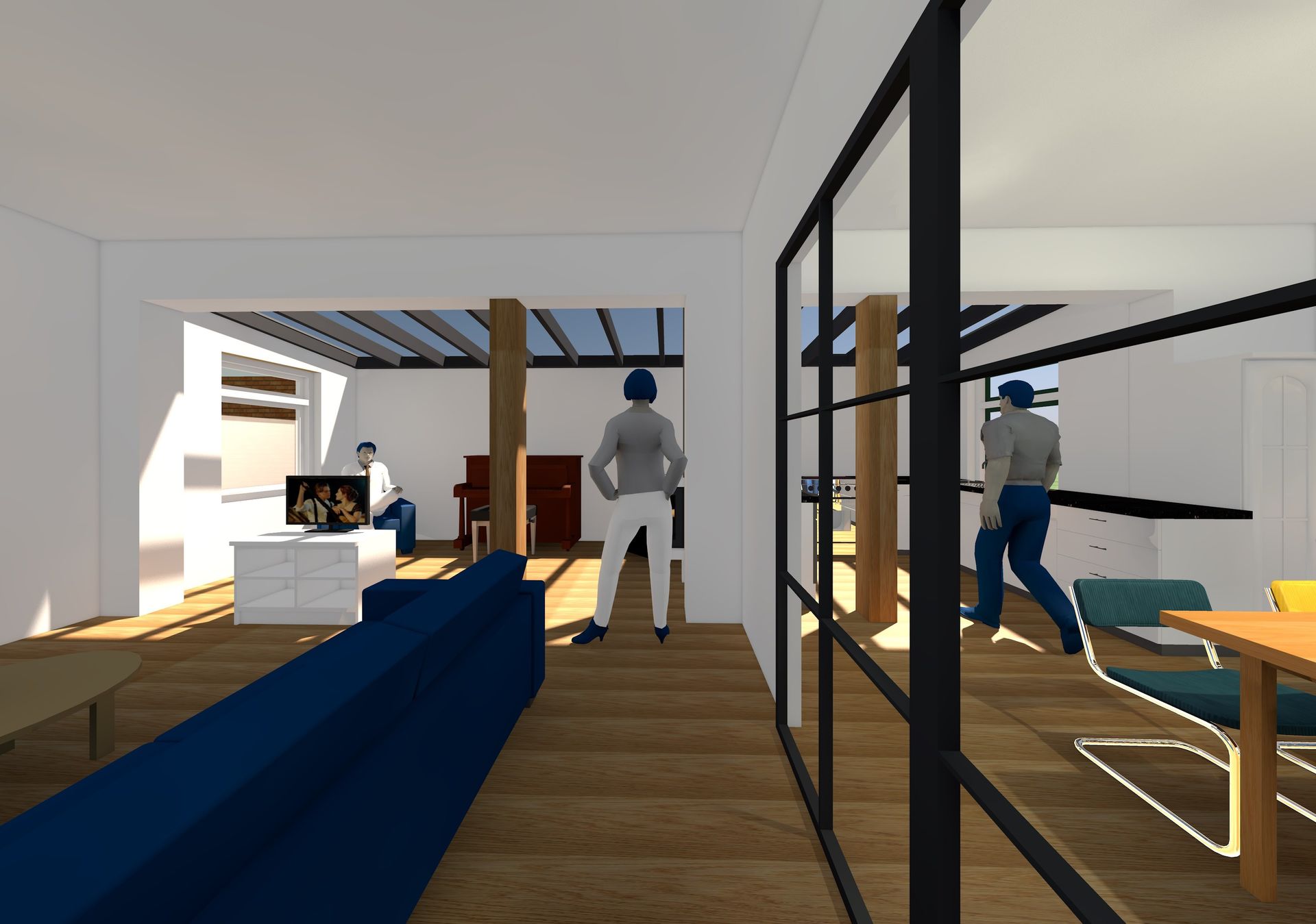 Voor iedereen een plekje in dit huis maar niet opgesloten! Ruimtelijke verbindingen waarbij iedereen op zijn plek is en toch ook in contact met de ander is.